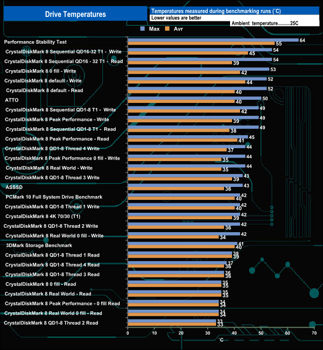 We took note of the drive’s temperature during some of our benchmarking runs. The hottest the heatsink version of the Black SN850X got was when it was being pushed very hard during the performance stability test when it peaked at 64° C which is 21° C under the maximum operating temperature. The drive averaged 38.8° C for the remaining tests which is comfortably below that maximum operating temperature.