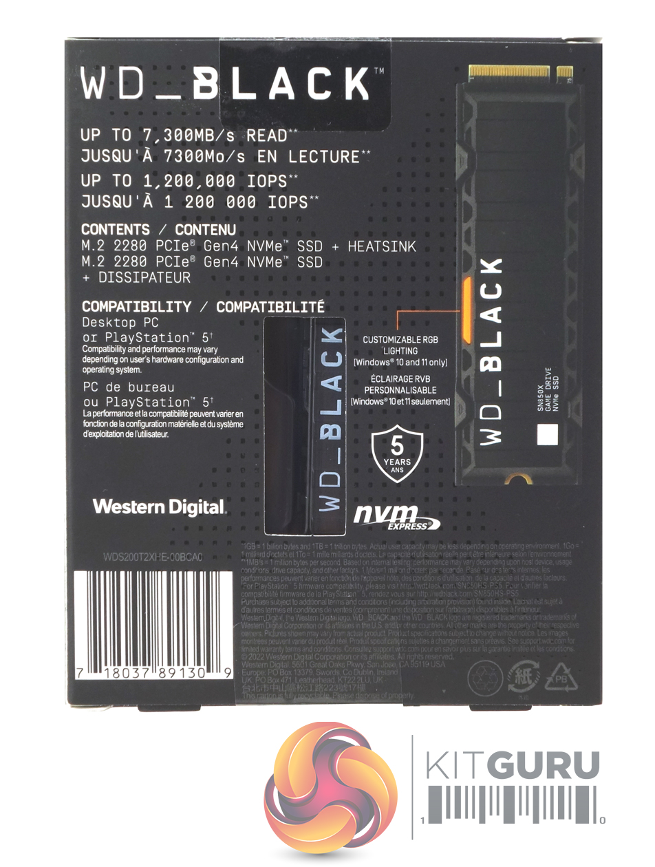 The drive arrives in a smallish box with a clear image of the drive on the front. WD is obviously keen to let you know that this is a fast drive, too, as the 7,300MB/s Sequential read figure is displayed in the bottom right corner of the box. Above this WD highlights the interface the drive uses and its capacity.