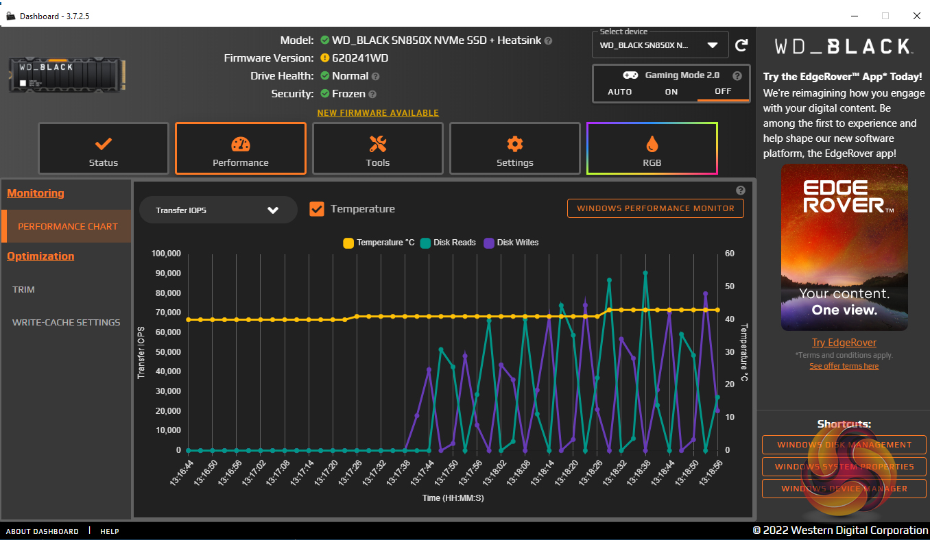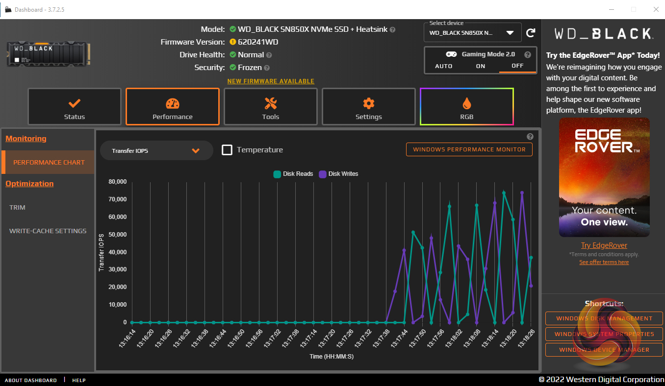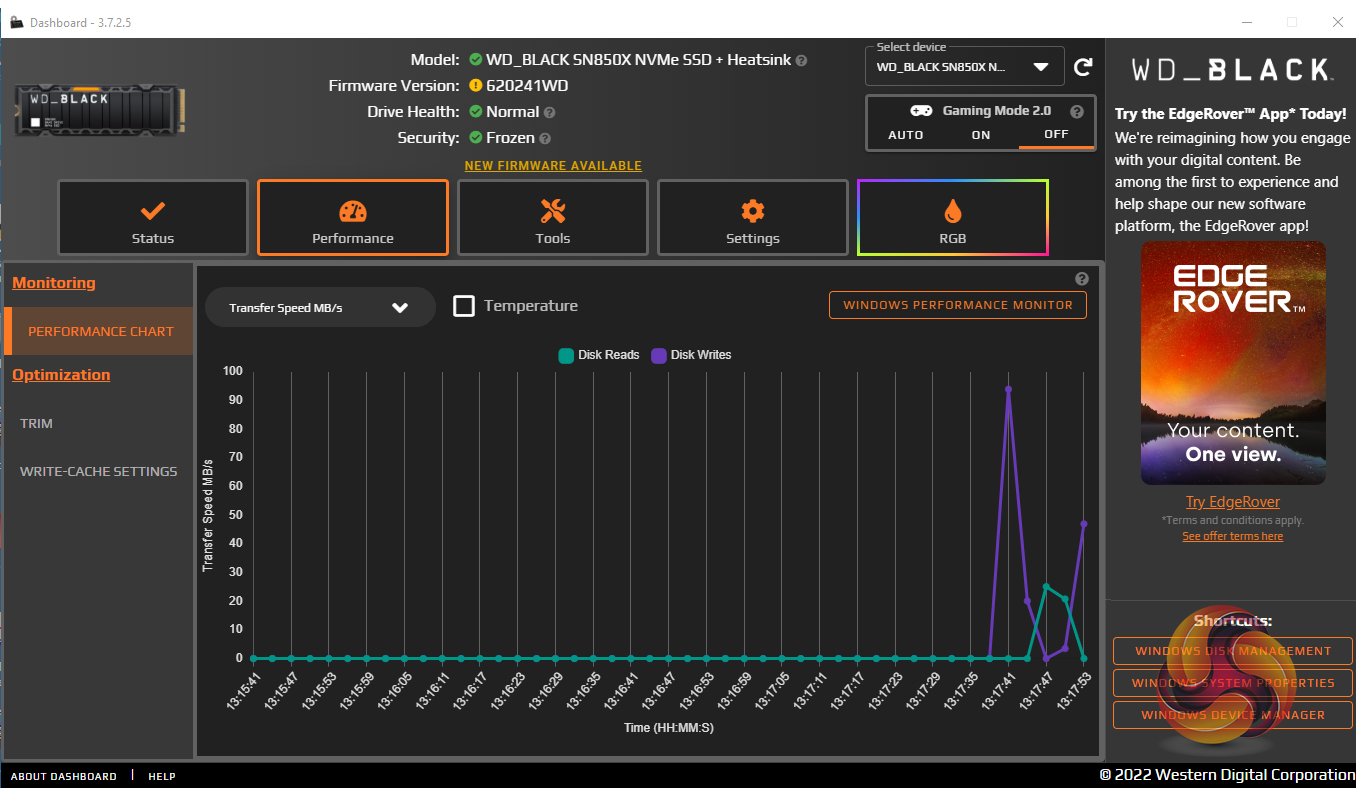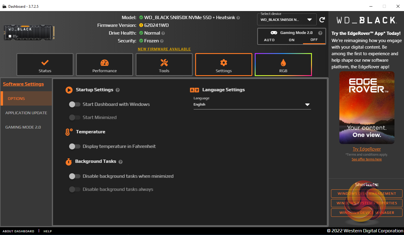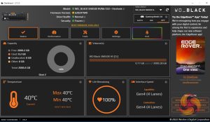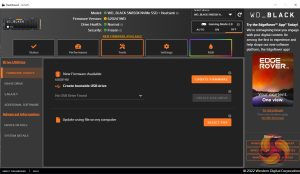 WD's SSD management utility goes by the name of SSD Dashboard. SSD Dashboard is pretty comprehensive and allows you to monitor drive status, and performance, perform secure erases (currently only by making a bootable USB device), update firmware and monitor temperatures. It also includes a gaming mode which if enabled reduces latency by disabling the low power modes via the firmware.