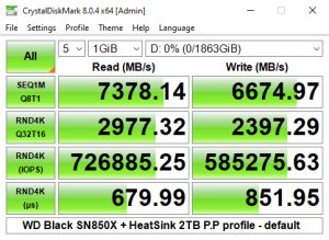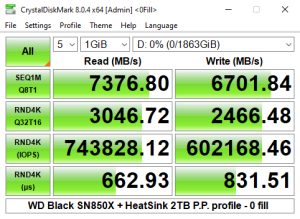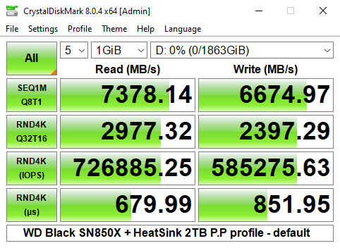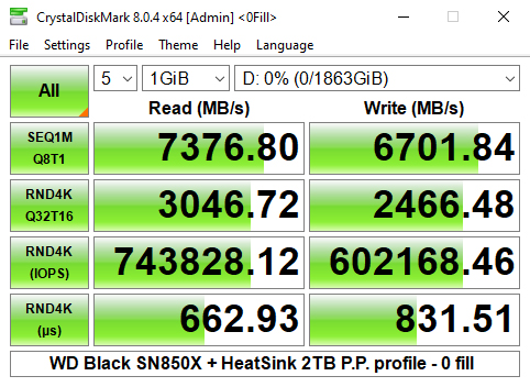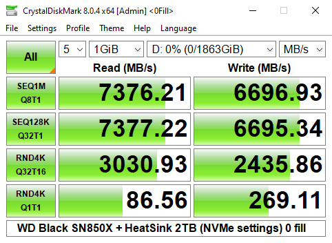 We could however confirm the official maximum read/writes speeds (7,300MB/s and 6,600MB/s respectively) with a read test result of 7,377MB/s (default) and 6,696MB/s (0 fill) for writes.