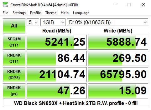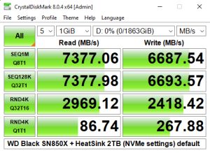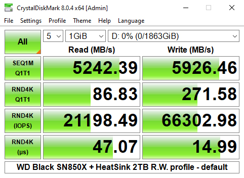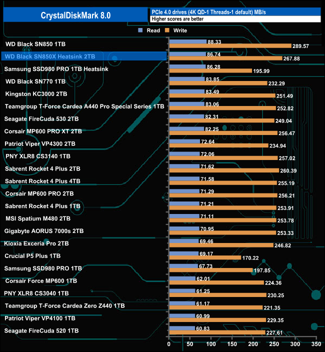 When we tested the Black SN850X with CrystalDiskMark 8's 4K QD1 1 Thread test we got read (86.74MB/s) and write (267.88MB/s) results that were a little slower than what we saw for the Black SN850 drive.