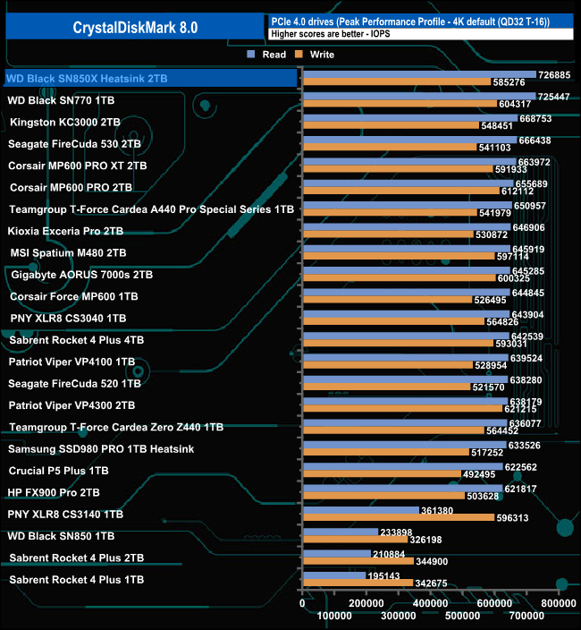 Switching over to the default Peak Performance profile we saw a 4K random read best of 726,685 IOPS with a write result of 582,276 IOPS, both well short of the official 1.2M IOPS and 1.1M IOPS maximums. However, while we didn't get close to the official figures, that 726,885 IOPS read figure is the fastest we've seen to date for consumer Gen4 NVMe SSD. Using the 0 fill (compressible data) tests we saw improvements in both the read (743,828 IOPS) and write (602,168 IOP) performance.