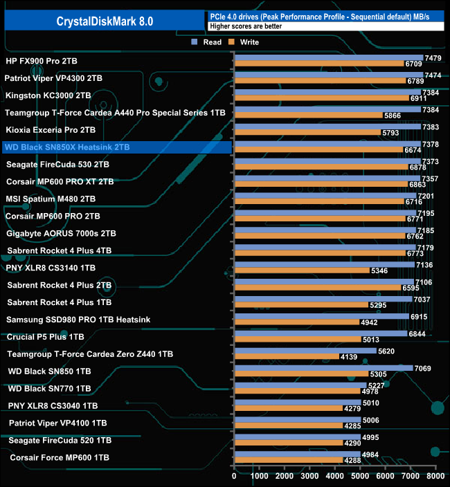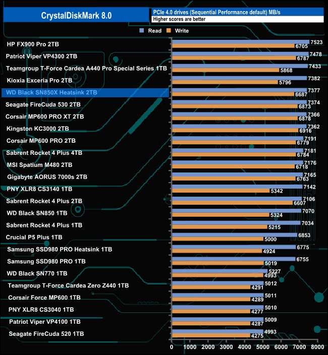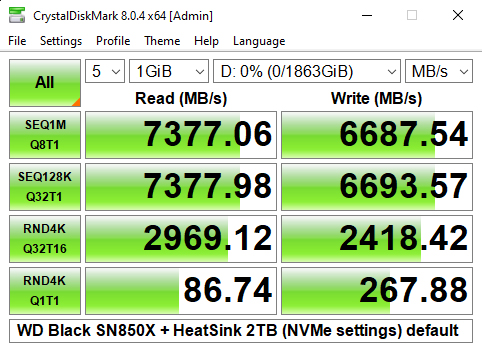 The Sequential read result of 7,377MB/s puts the drive into the top five of Gen 4 consumer drives we've tested to date