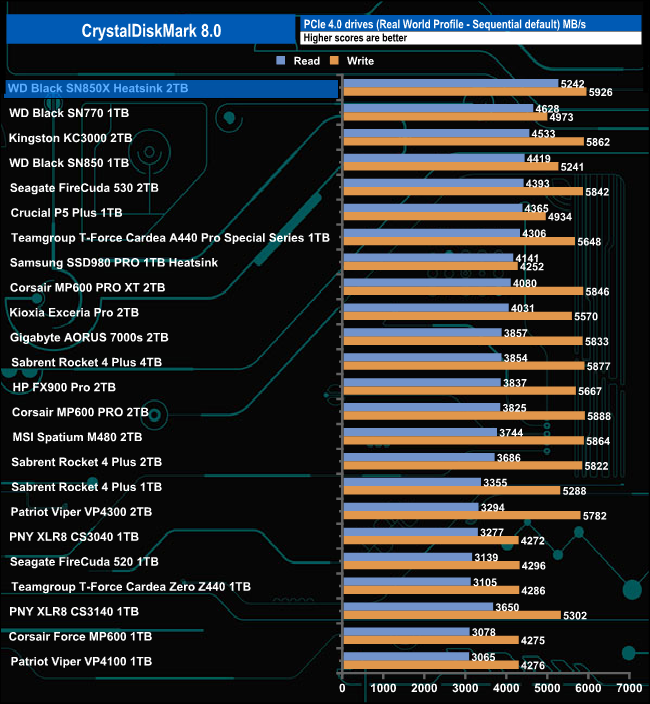 Using the Real World profile sees the drive topping the Sequential results chart with a read score of 5,242MBs with writes at an impressive 5,926MB/s.