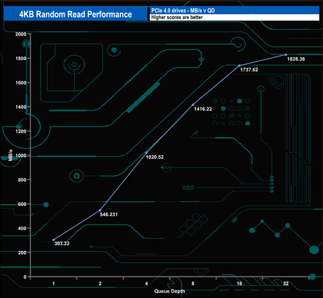 We used CrystalDiskMark 8‘s custom settings to test the 4K random read performance of the drive through a range of queue depths. The setup for the tests is listed below.