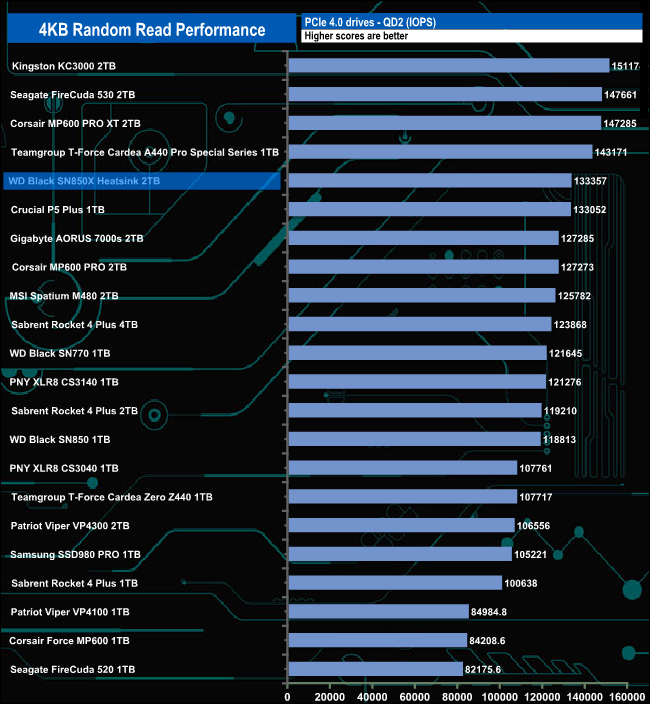 At QDs 1, 2 & 4 the drive hovers around the top five of the drives we've tested to date. However at QD32, the 446,377 IOPS figure from the drive sees it in second place in the chart behind another WD Black drive, the SN770.