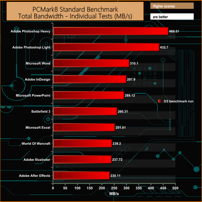 Just like the Consistency test, PCMark 8’s standard Storage test also saves a large amount of performance data. The default test runs through the test suite of 10 applications three times. Here we show the total bandwidth performance for each of the individual test suites for the third and final benchmark run.