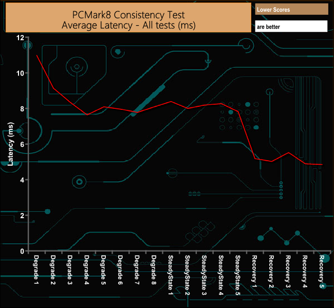Futuremark’s PCMark 8 is a very good all round system benchmark but it’s Storage Consistency Test takes it to whole new level when testing SSD drives. It runs through four phases; Preconditioning, Degradation, Steady State, Recovery and finally Clean Up. During the Degradation, Steady State and Recovery phases it runs performance tests using the 10 software programs that form the backbone of PCMark 8; Adobe After Effects, Illustrator, InDesign, Photoshop Heavy and Photoshop Light, Microsoft Excel, PowerPoint, Word, Battlefield 3 and World of Warcraft. With some 18 phases of testing, this test can take many hours to run.