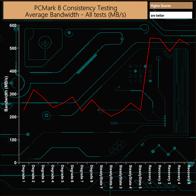 The WD Blue SN500 gets hit hard in the PCM8 Consistency test but it does recover very well, if somewhat erratically from the ordeal.