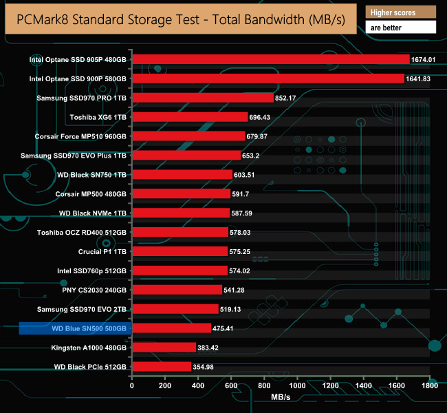 Even though it only uses an x2 PCIe interface, the drive produces 475MB of total bandwidth for the PCMark8 Standard Storage Test.