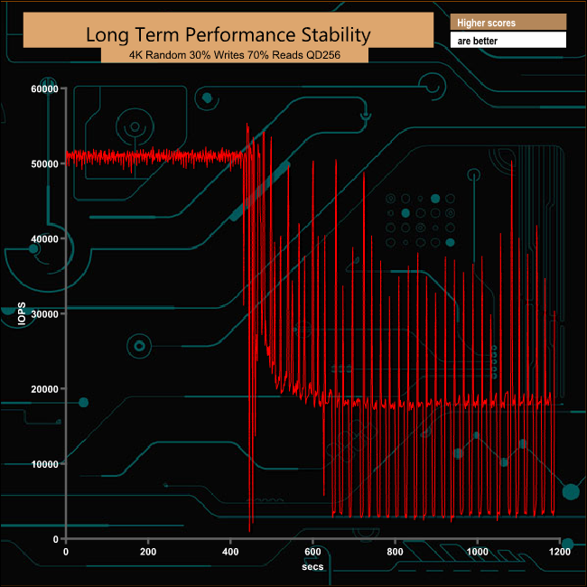 For the long term performance stability test, we set the drive up to run a 20-minute 4K random test with a 30% write, 70% read split, at a Queue Depth of 256 over the entire disk. The WD Blue SN500 500GB drive averaged 30,337 IOPS for the test with a performance stability of 59.6%, which is good for a drive of this class.