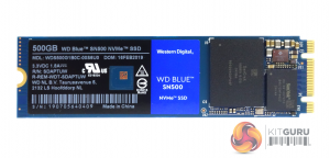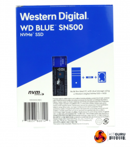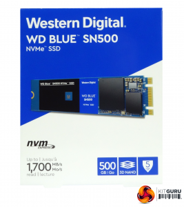 The WD Blue SN500 comes in a smallish box with a clear image of the drive on the front. In the bottom left corner of the box, the 1,700MB/s Sequential read figure is highlighted. Next to this are three boxes displaying the capacity of the drive, the fact it uses 3D NAND and that it comes with a 5-year warranty.
