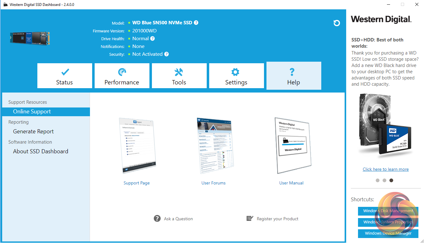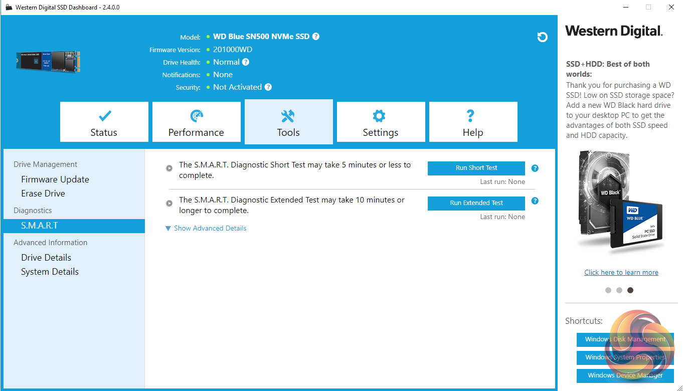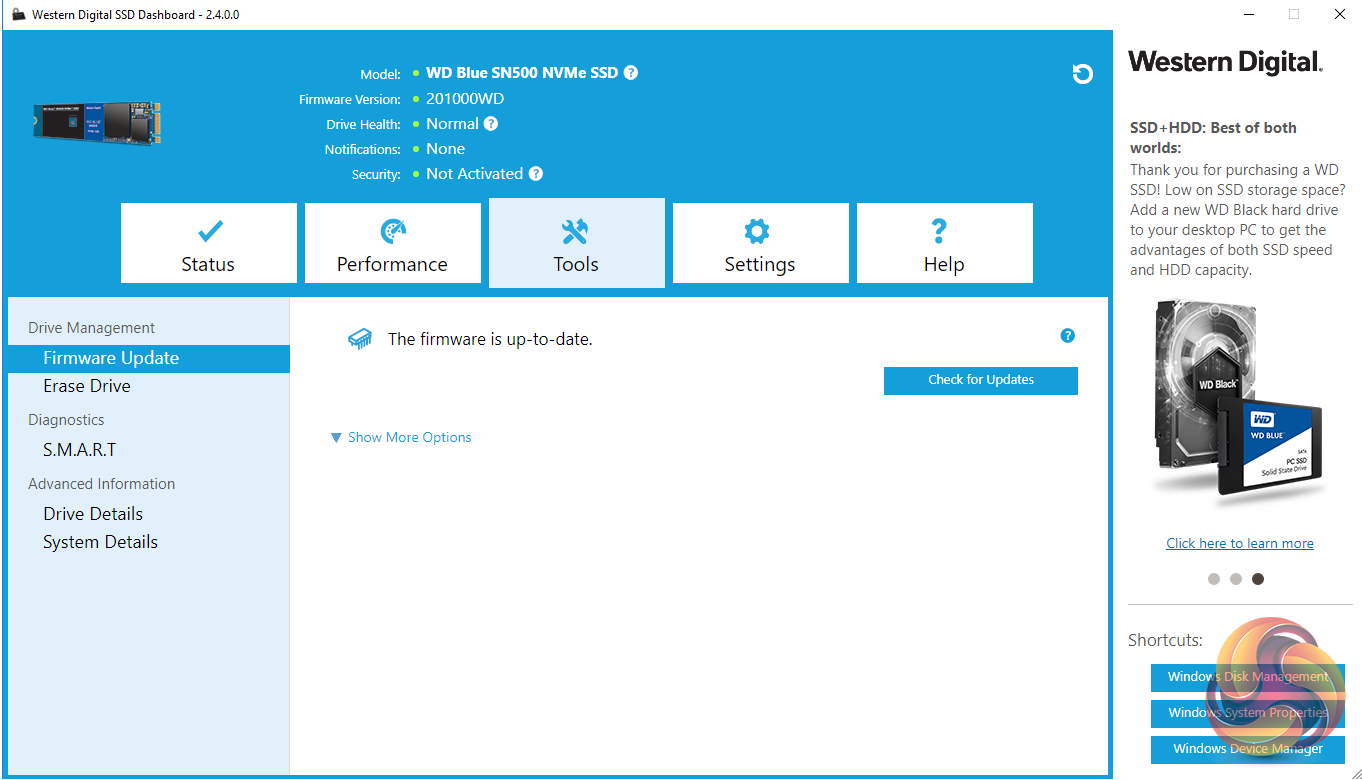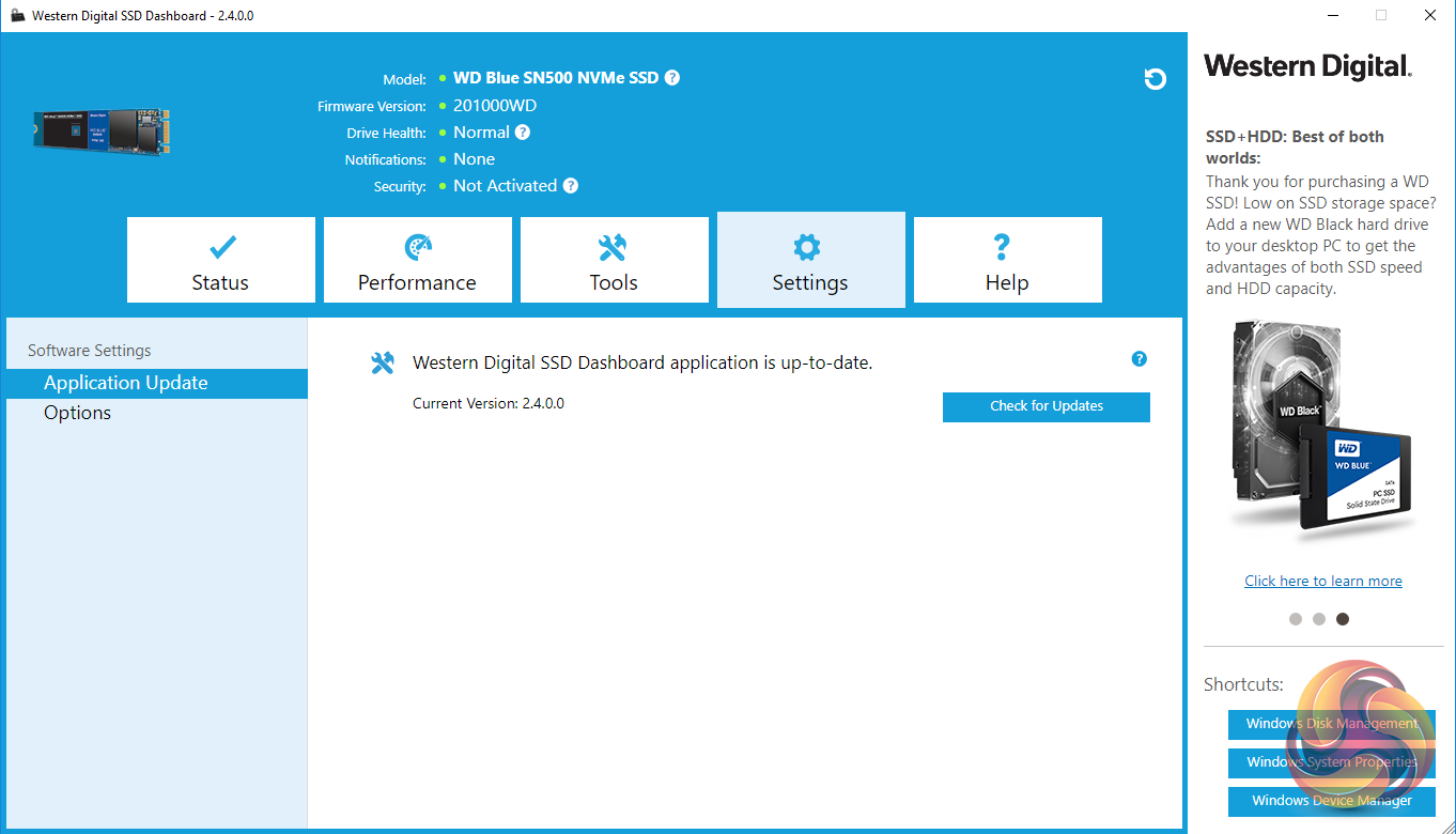 WD’s SSD management software goes by the name of SSD Dashboard, though it's not the new fancy version that supports the latest Black NVMe drive range of drives, it's the plainer-looking standard version. With it you can monitor drive status, performance, secure erase (currently only by making a bootable USB device), update firmware and monitor temperatures. There’s no cloning tool integrated into the utility but you can download Acronis True Image WD Edition from the WD website.