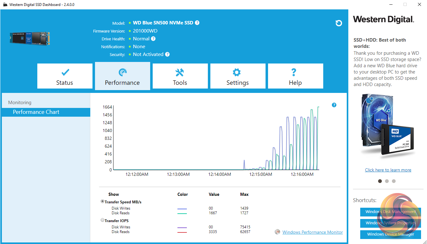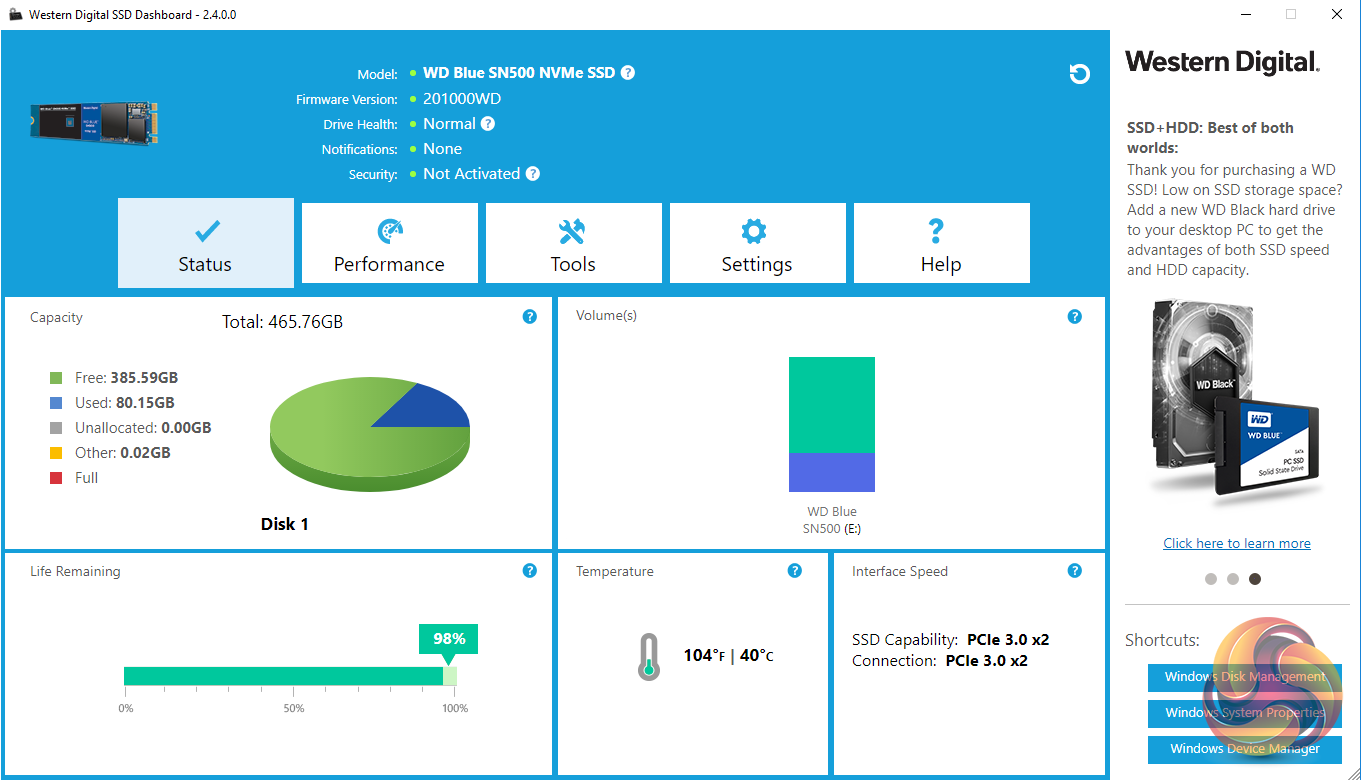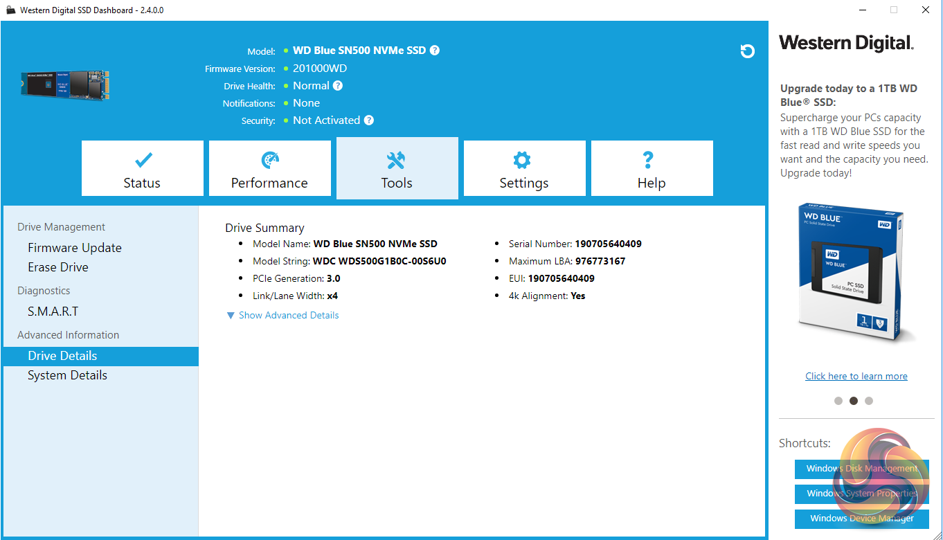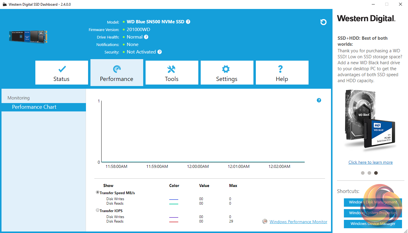 WD’s SSD management software goes by the name of SSD Dashboard, though it's not the new fancy version that supports the latest Black NVMe drive range of drives, it's the plainer-looking standard version. With it you can monitor drive status, performance, secure erase (currently only by making a bootable USB device), update firmware and monitor temperatures. There’s no cloning tool integrated into the utility but you can download Acronis True Image WD Edition from the WD website.