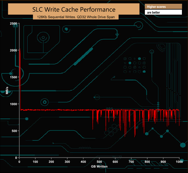 The 1TB WD Blue SN550 cache fills with data at around 13GB of writes, with the performance dropping to an average of 871MB/s after the cache is full.