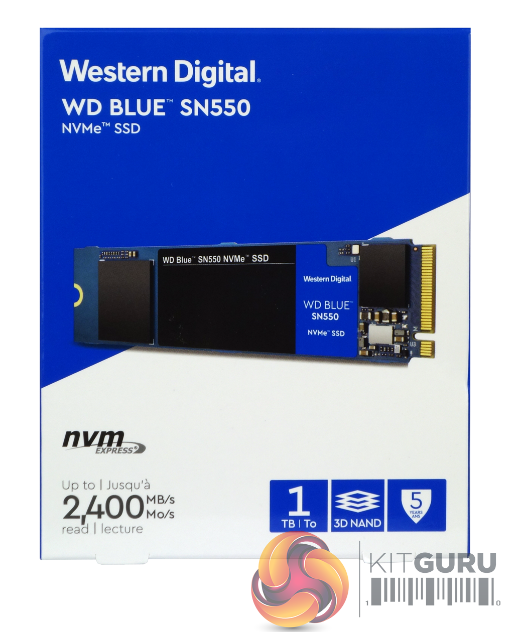 The WD Blue SN550 comes in a smallish box with a clear image of the drive on the front. In the bottom left corner of the box, the 2,400MB/s Sequential read figure is highlighted. Next to this are three boxes displaying the capacity of the drive (in this case 1TB), the fact it uses 3D NAND and that it comes with a 5-year warranty.