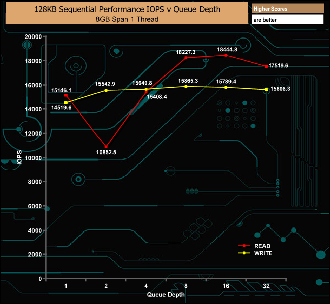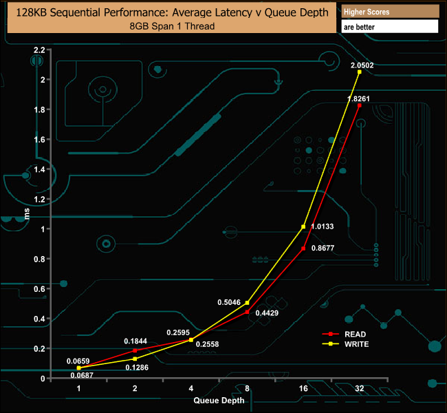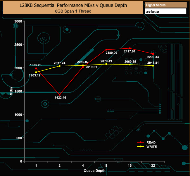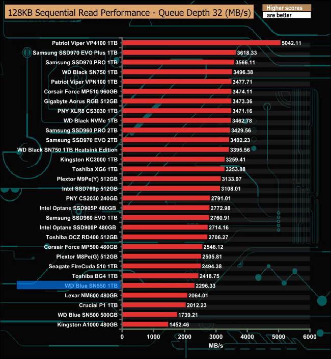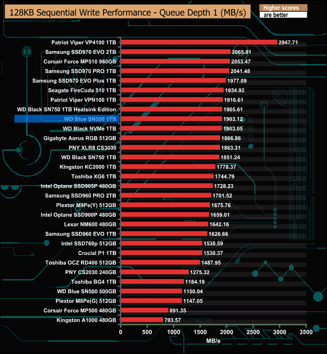 At a QD of 1, the SN550 shows very strong performance not only compared to the previous SN500 but to both SN750 Black drives, However as the QD deepens the two Black model drives pull away from the SN550 but it still remains much faster than the older SN500 thanks to its PCIe x4 interface and 96-layer NAND.