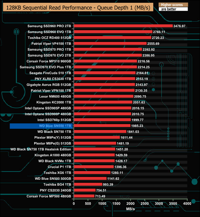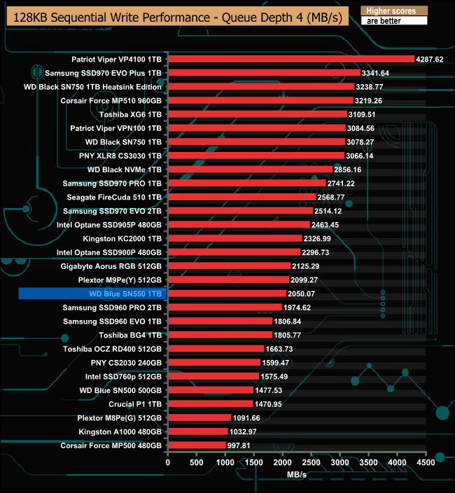 At Queue Depth's 1 and 2, the WD Blue SN550 is not only much faster than the previous SN500 drive, it is also faster than both versions of the WD Black SN750 we've tested. However, at a QD of 32, the SN550 as you might expect drops back compared to the two Black SN750 drives.