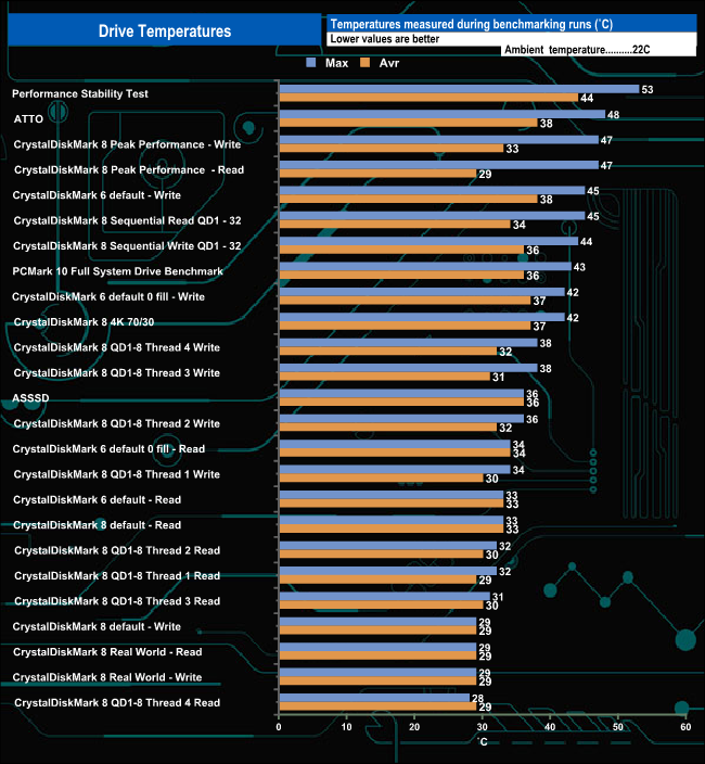 We took note of the drive’s temperature during some of our benchmarking runs. The WD Blue SN570 doesn’t have a heatsink, but there is plenty of empty space on the PCB to allow air circulation around the components. The hottest the drive got was when it was being pushed very hard during the Performance Stability test run when it peaked at 53° C.