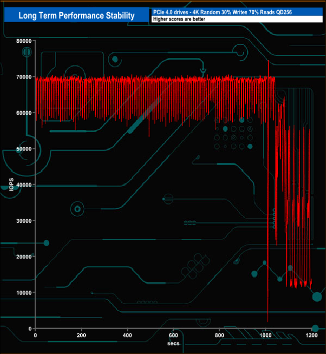 For the long term performance stability test, we set the drive up to run a 20-minute 4K random test with a 30% write, 70% read split, at a Queue Depth of 256 over the entire disk. The 1TB WD Blue SN570 averaged 63,220 IOPS for the test with a first-rate performance stability of 89%.