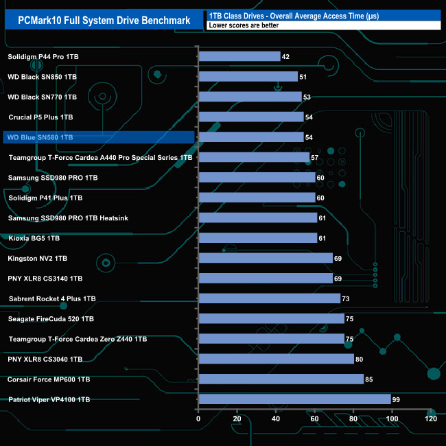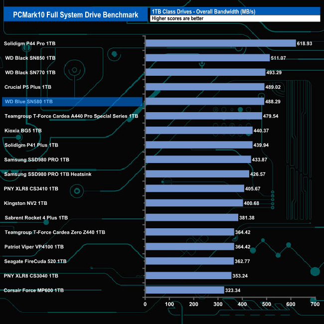 The overall bandwidth figure of 488.20MB/s sees the WD Blue SN580 in the top five in our results chart. Incidentally, the previous generation SN570 produced a bandwidth result of 333.86 using a Gen 3 interface.