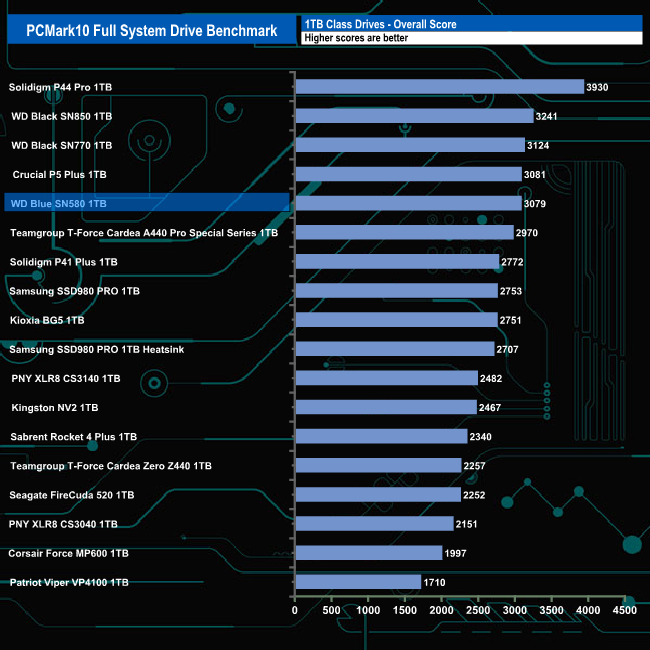 The WD Blue SN580 dealt with the rigours of the PCMark10’s Full System Drive reasonably well. The best result from the Creative set of test traces was the 946MB/s for the Heavy Use Adobe Photoshop trace. The drive averaged 192.3MB/s for the six Adobe startup traces and 449.6MB/s for the five Adobe usage traces including that Photoshop Heavy result.