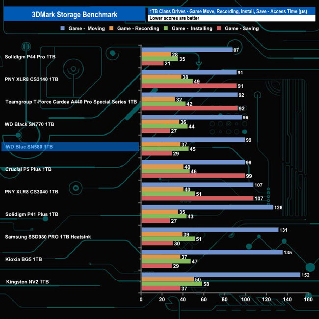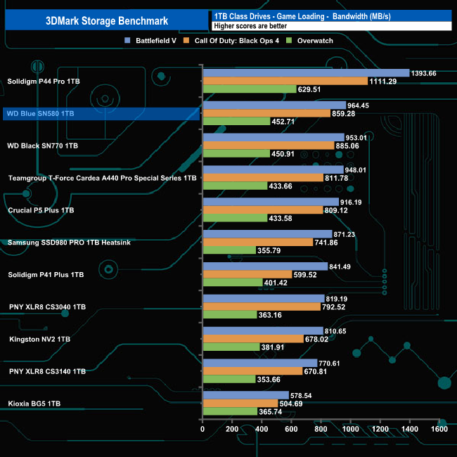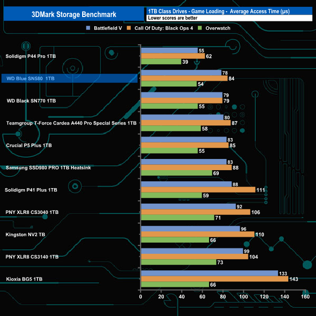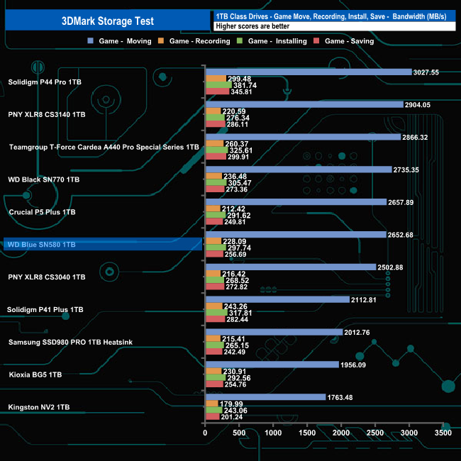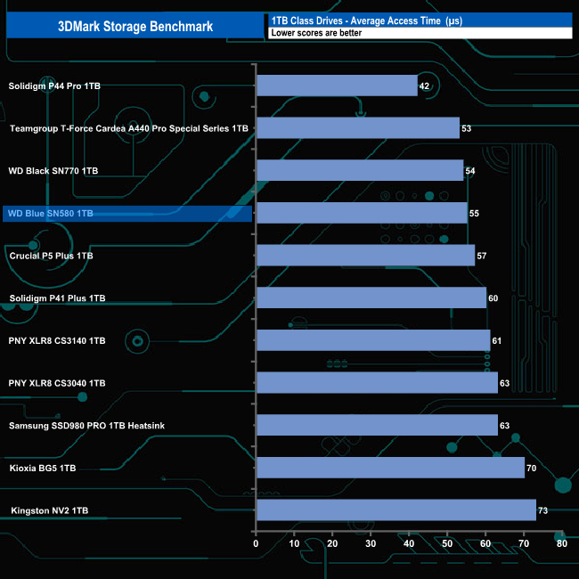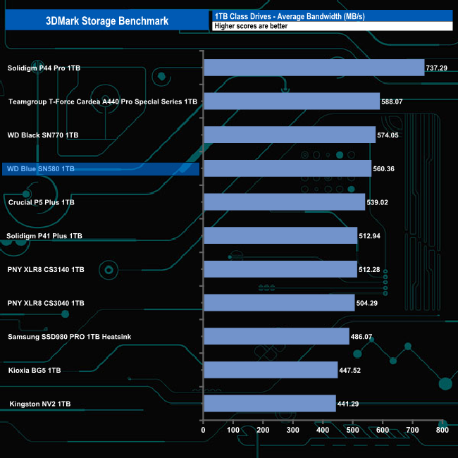 WD's Blue SN580 made a decent fist of the 3DMark Storage Benchmark with an average bandwidth score of 560MB/s, good enough to fill the fourth spot on the results chart but a long way off Solidigm's P44 Pro which sits in first place with a bandwidth figure of 737MB/s.