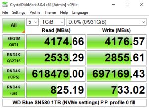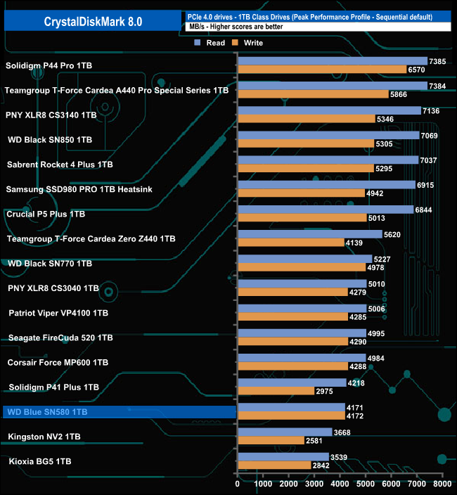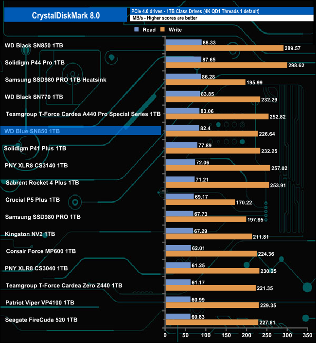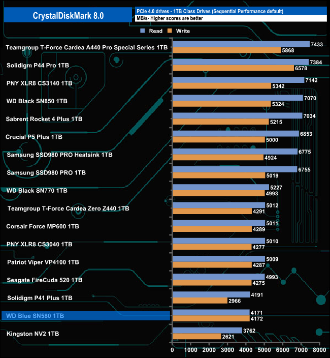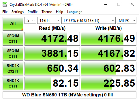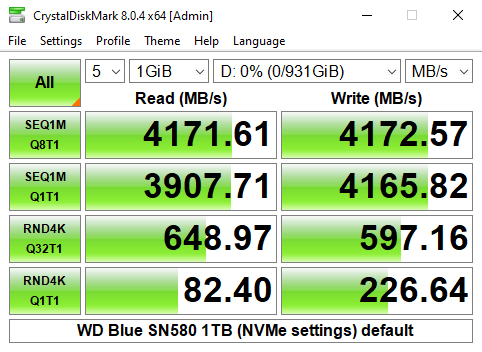 In the CrystalDiskMark 4K QD1 T1 test, the Blue SN580 does pretty well, with a 82.4MB/s read score with writes at 226.64MB/s, good enough to see it in sixth place in the results chart. It's also an improvement on the previous generation SN570 which scored 68.45MB/s and 200.67MB/s (read/writes respectively) for the same test.