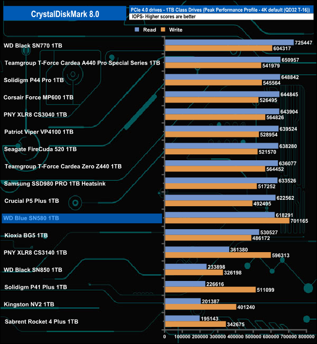 CrystalDiskMark 8's Peak Performance profile result screen displays the 4K result in IOPS. The best-read test result of 618,479 IOPS confirms and betters a little the official rating of up to 600,000 IOPS. However, the tested write result of 701,165 IOPS is someway short of the official 750,000 IOPS.