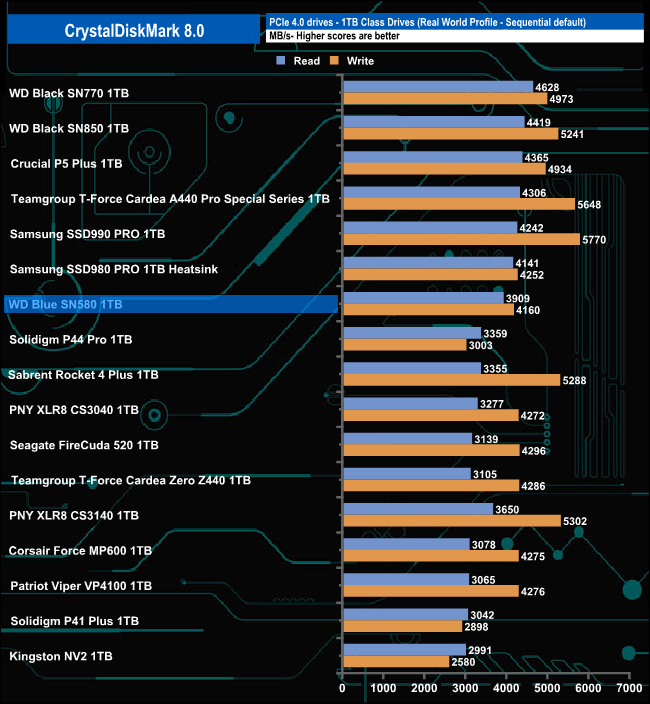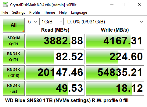 The Real World profile Sequential read/write results of 3,909MB/s and 4,160MB/s respectively show the improvement in performance that the Gen 4 interface, which the Blue SN580 uses, offers over the Gen 3 interface of the previous generation SN570. The SN580 read result is 1,195.20MB/s faster than the older drive while the write result is a 1,242.87MB/s improvement.