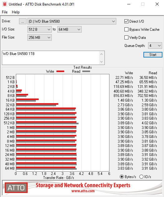 With the ATTO benchmark, we couldn't quite hit the official maximum Sequential ratings of 4,150MB/s for both reads and writes with best test results of 3,900MB/s and 3,780MB/s for read and writes respectively.