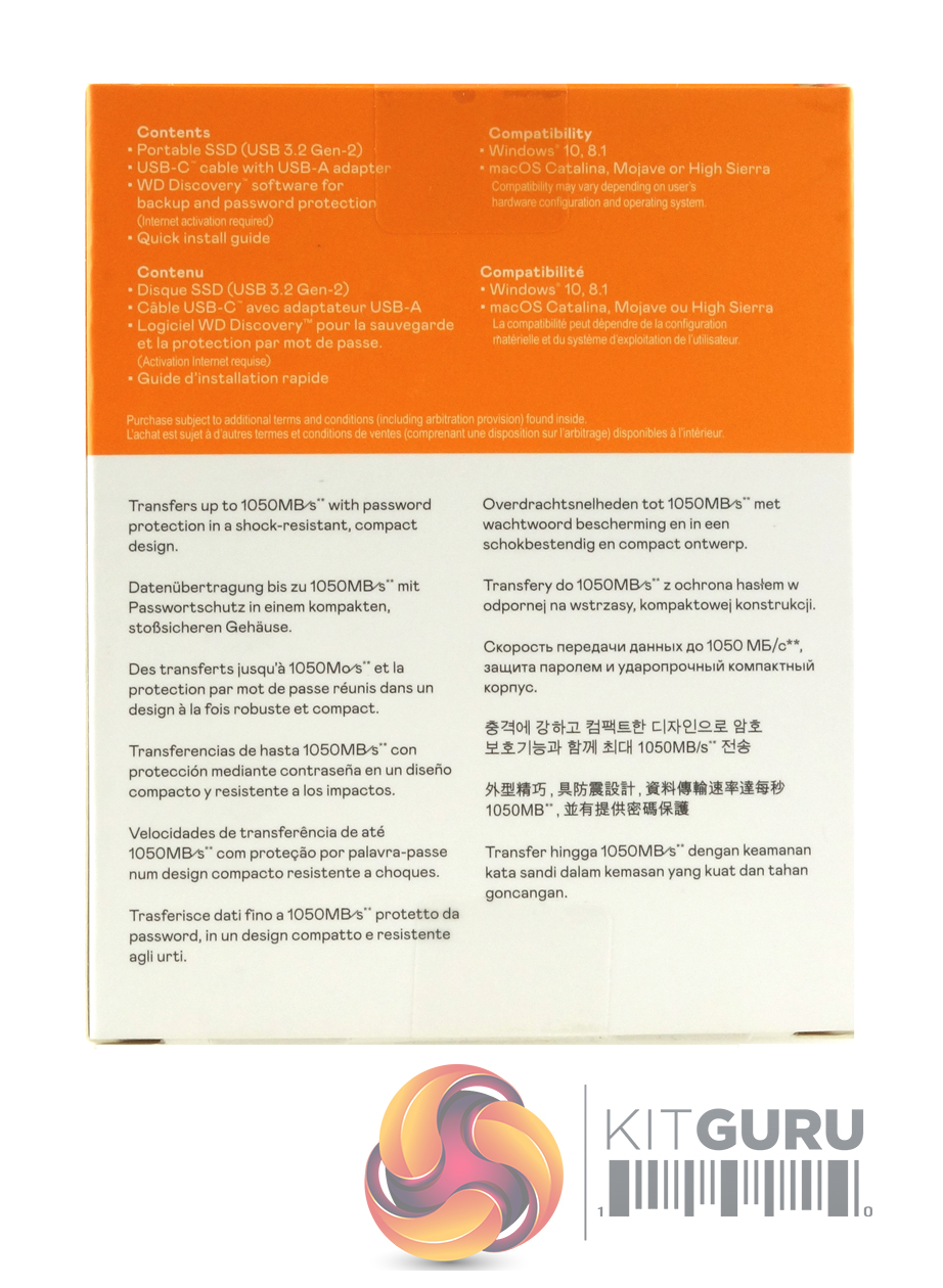 The rear of the box has some multilingual marketing data about the drive along with a list of what’s in the box and the drive's compatibility.
