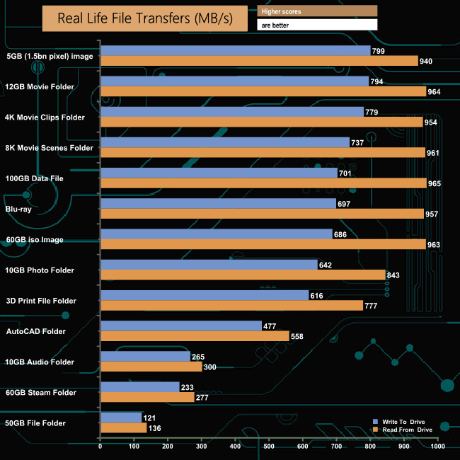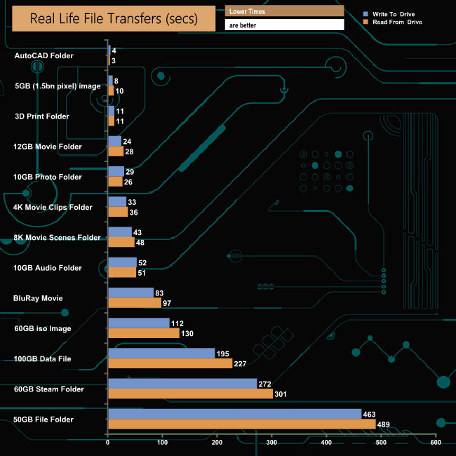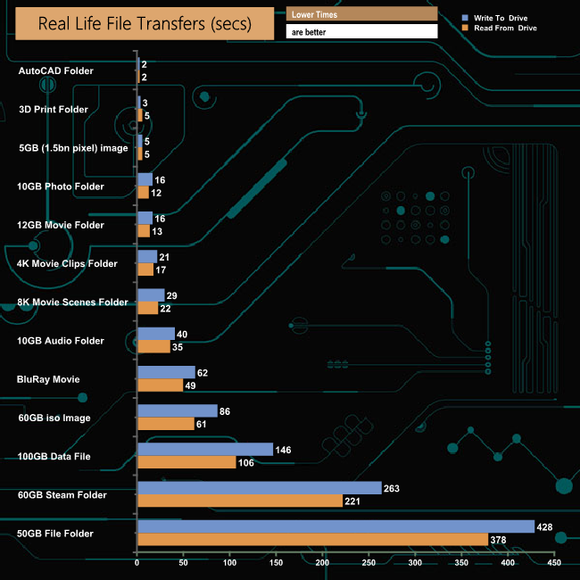 Taking the SATA drive out of the loop shows just how fast the My Passport SSD can perform, although the 60GB Steam, 50GB File and 10GB Audio folder transfers are still very slow compared to the large file transfers.