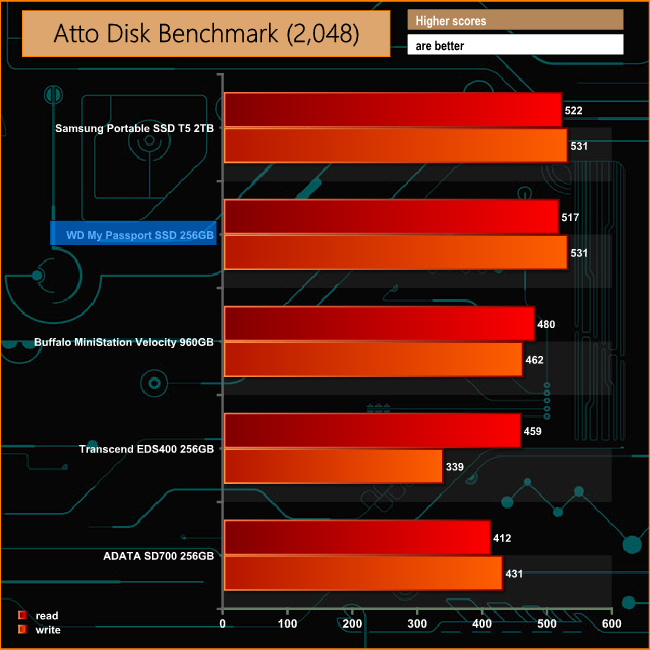WD quote transfer speeds of up to 515MB/s for the My Passport SSD, which was confirmed by the ATTO benchmark. The 256GB drive produced a Sequential read score of 517MB/s and 531MB/s for writes. It's very nearly as fast as Samsung's T5 for reads with an identical write performance.