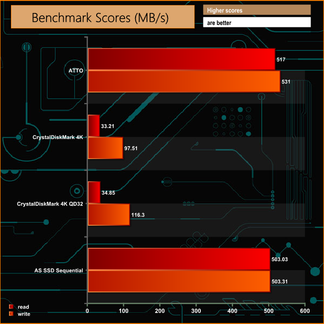 AS SSD is a great free tool designed just for benching Solid State Drives. It performs an array of sequential read and write tests, as well as random read and write tests with sequential access times over a portion of the drive. AS SSD includes a sub suite of benchmarks with various file pattern algorithms but this is difficult in trying to judge accurate performance figures.