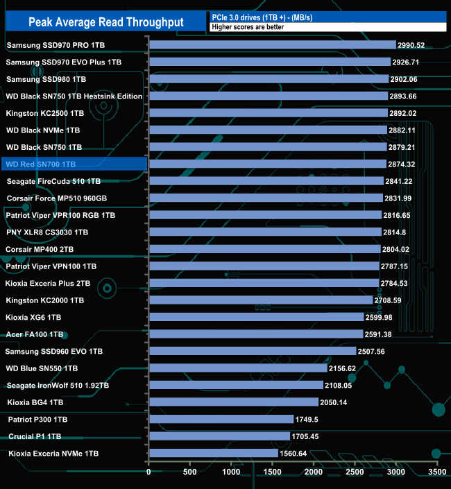 In our read throughput test, the WD Red SN700 peaked at the 8MB block mark with a test result of 2,874.32MB/s.