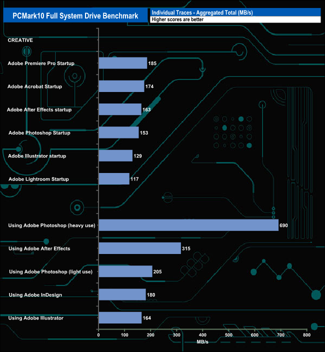 The PCMark 10 Full System Drive Benchmark uses a wide-ranging set of real-world traces from popular applications and common tasks to fully test the performance of the fastest modern drives. The benchmark is designed to measure the performance of fast system drives using the SATA bus at the low end and devices connected via PCI Express at the high end.