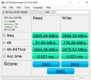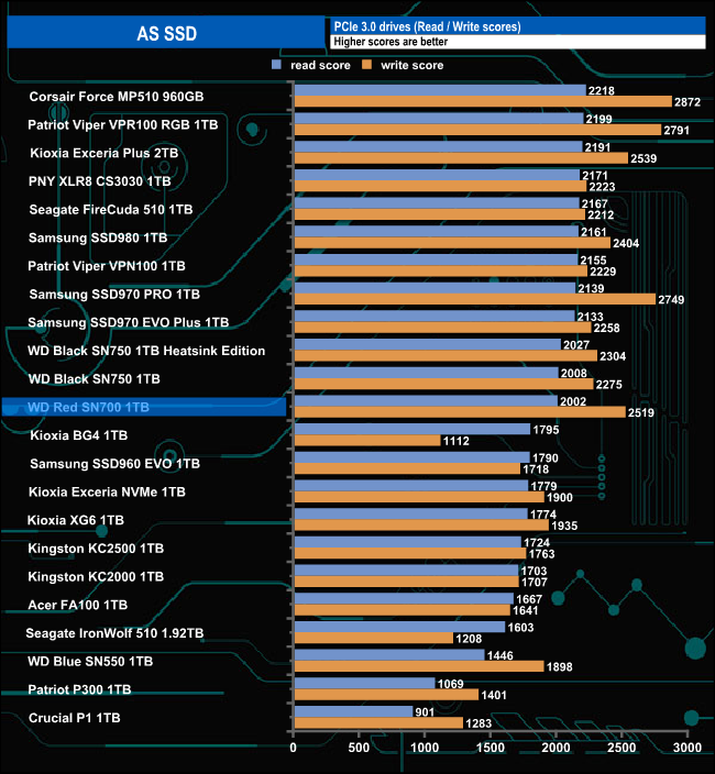 The AS SSD read score of 2002 sees the drive in a mid-table position although its write score of 2519 is the fifth-fastest we've seen to date for a Gen 3 drive.