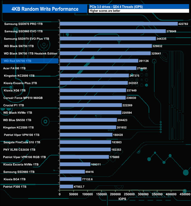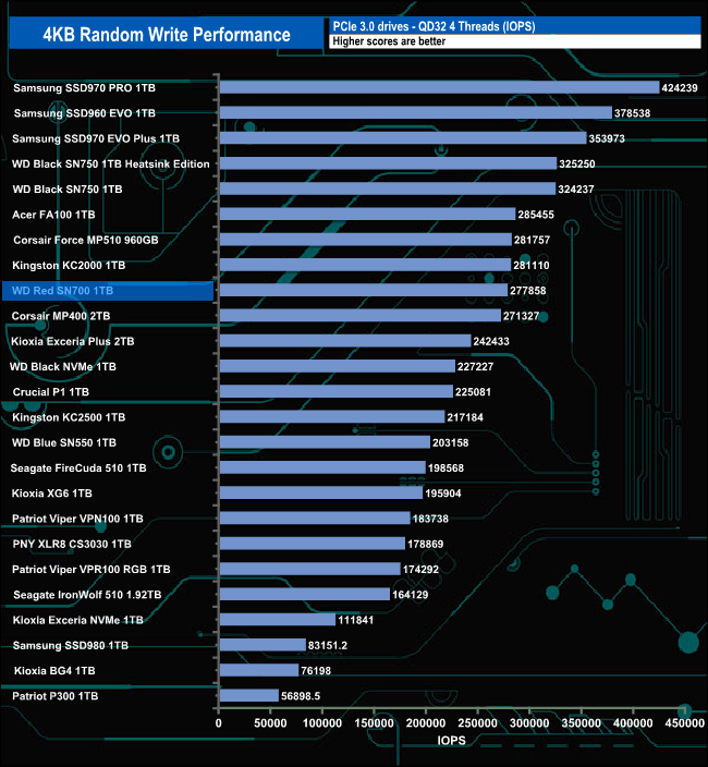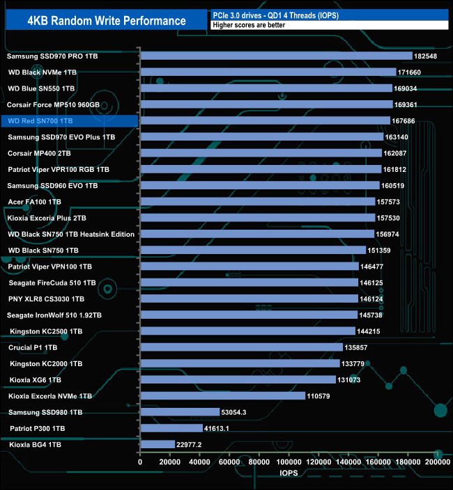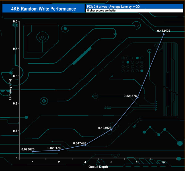 The drive holds its position in our random write results charts at the lower queue depths (1-4) before losing ground on drives around it at QD32 at the end of the test run.