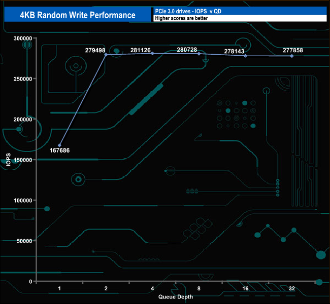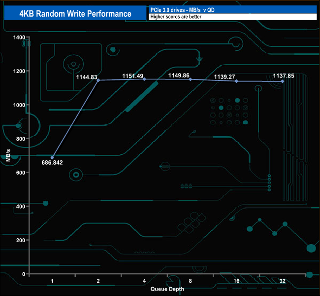 When it comes to our 4K random write tests, the drive peaked at QD4 with a test result of 281,126 IOPS before slowly dropping back as the queue depth deepens to finish the test run at QD32 with a figure of 277, 858 IOPS (1,137.85MB/s) and as with the random read tests, our random write results were some way distant of the official 560,000 IOPS.