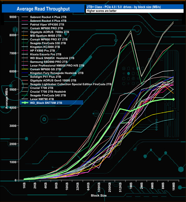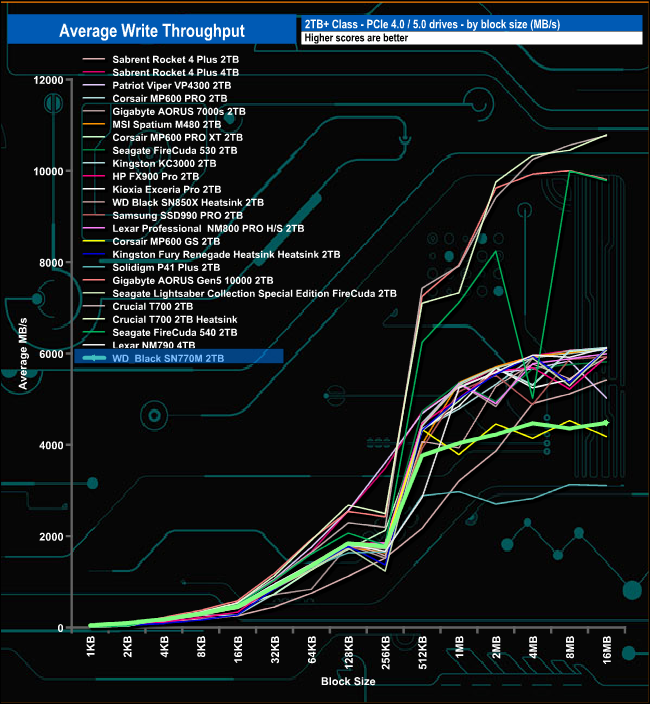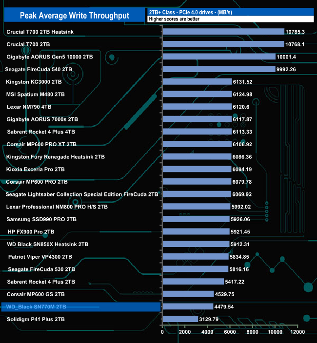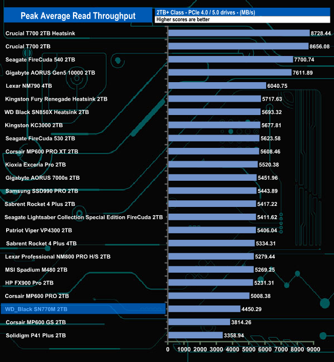 The peak read throughput test result of 4,450.29MB/s for the Black SN770M sees it in the bottom half of our results chart.