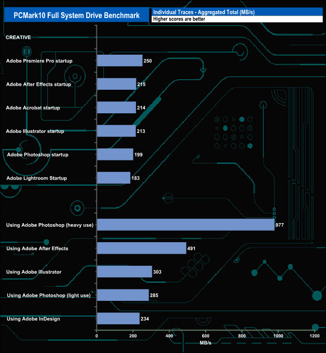 The PCMark 10 Full System Drive Benchmark uses a wide-ranging set of real-world traces from popular applications and common tasks to fully test the performance of the fastest modern drives. The benchmark is designed to measure the performance of fast system drives using the SATA bus at the low end and devices connected via PCI Express at the high end.