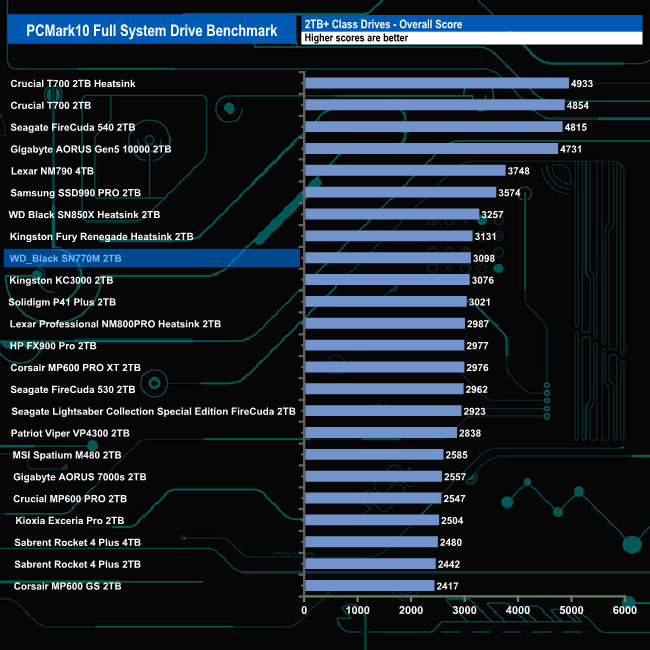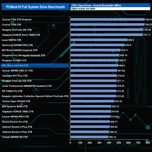 The overall bandwidth figure of 494.5MB/s sees the WD_ Black SN770M sitting in a mid-table position.
