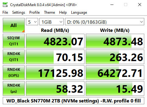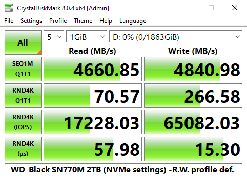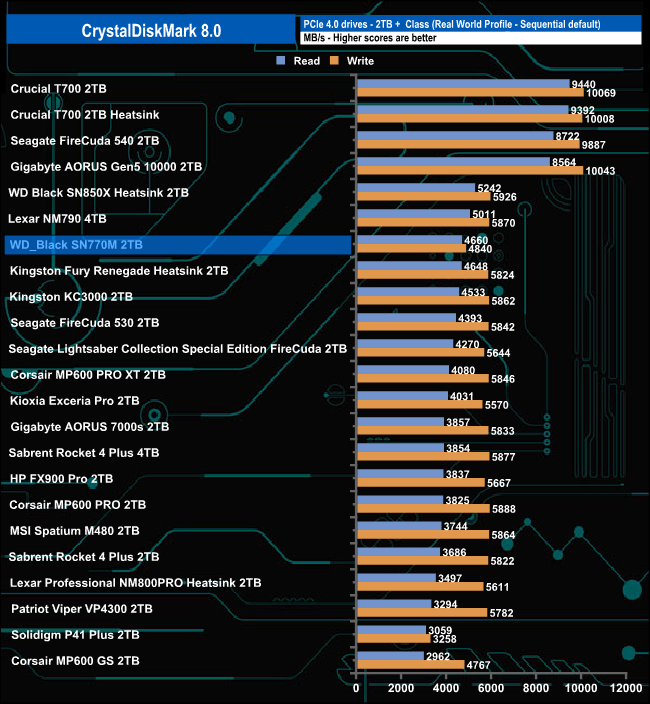 The WD_Black 770M performs well in the Real World profile test. With Sequential read/write scores of 4,660MB/s and 4,840MB/s respectively the drive slips into the top 10 of Gen 4 drives tested with this benchmark.