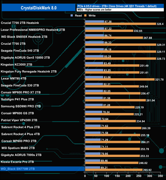 Although its read score of 69.21MB/s sees the drive at the bottom of the CrystalDiskMark 8 4K T1 QD1 test results chart, its write score of 266.92MB/s is one of the better ones we've seen for a Gen 4 drive.