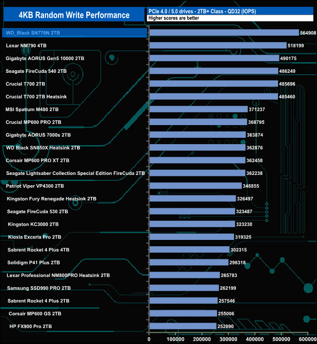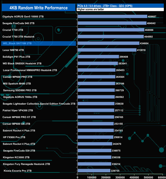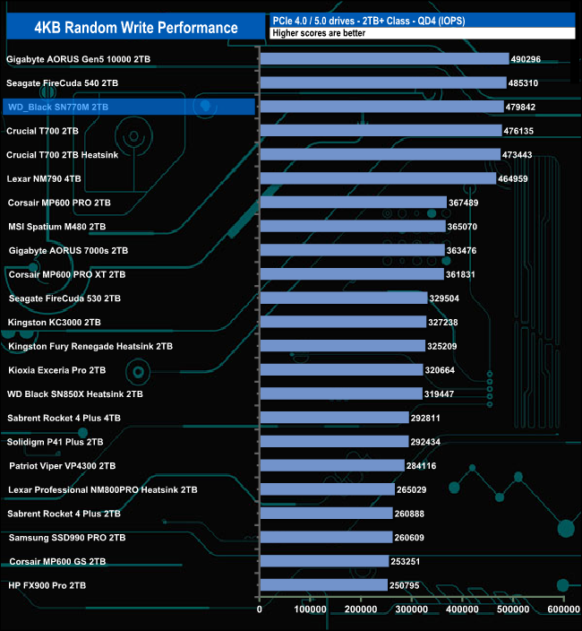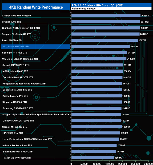 Officially the WD_Black SN770M is rated at up to 800,000 IOPS for 4K random writes. Using our 4-threaded tests we fell a long way short of this mark, the best we saw was 564,908 IOPS (QD32).