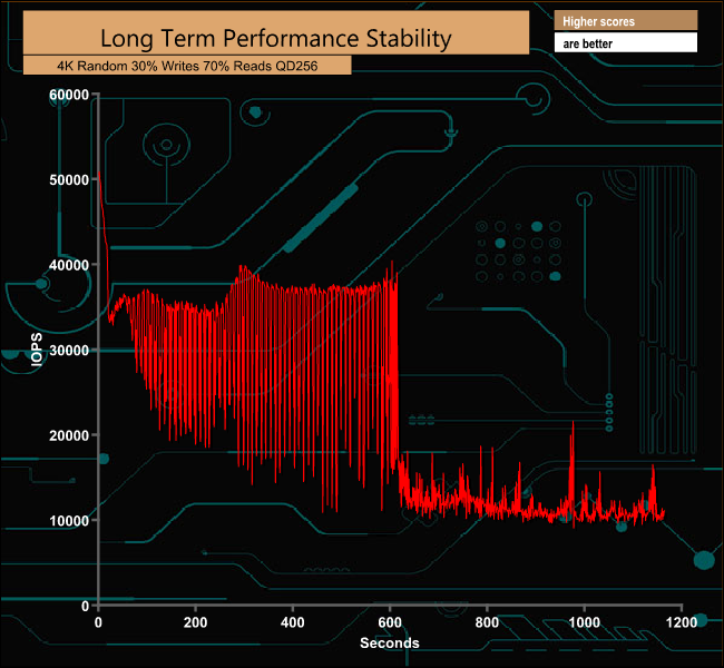 For the long term performance stability test, we set the drive up to run a 20-minute 4K random test with a 30% write, 70% read split, at a Queue Depth of 256 over the entire disk. The WD Black PCIe 512GB drive averaged 23,017 IOPS for the test with a performance stability of 53.17%.