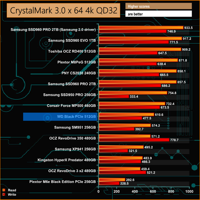 The WD Black PCIe drive lags behind the rest of its peers when it comes to dealing with small bity files at a queue depth of 32 for both reads and writes. At a shallow queue depth, its write performance completely outshines the read.