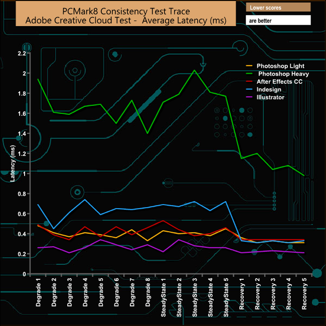 PCMark 8’s Consistency test provides a huge amount of performance data, so here we’ve looked a little closer at how the WD Black PCIe 512GB performs in each of the benchmarks test suites.