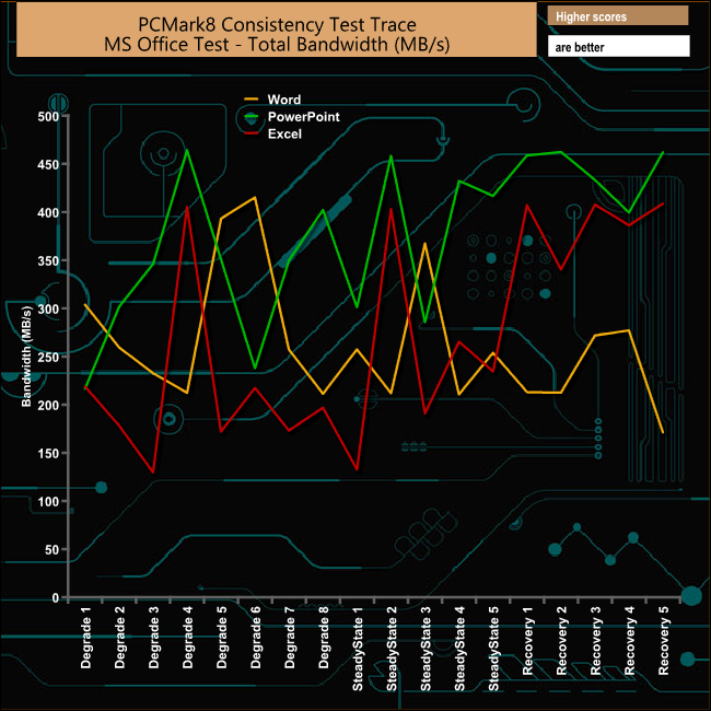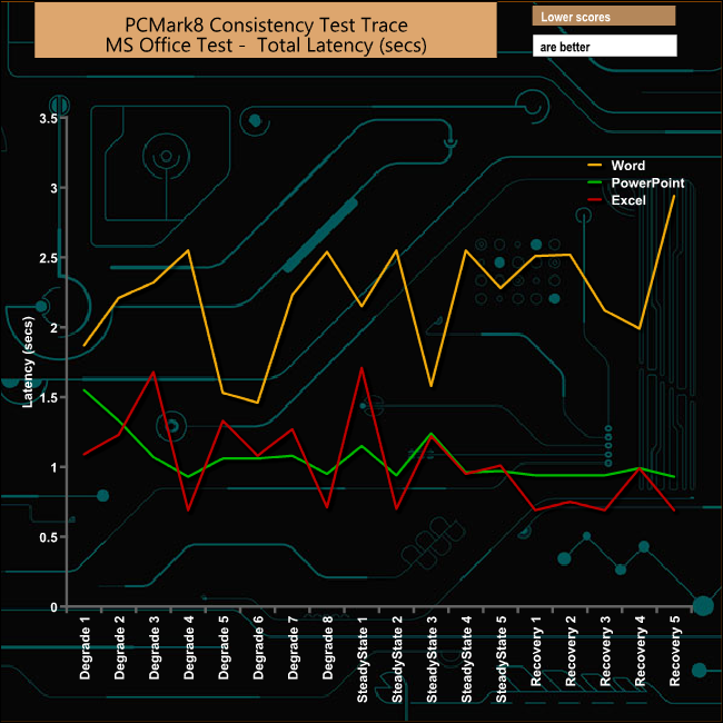 The drive's performance in the Microsoft Office test suite is erratic to say the least. All the way through the test cycle for all three programs the drive doesn't show much in the way of consistency. Although the drive eventually recovers well in the PowerPoint and Excel test runs, it doesn't recover at all well from the Word tests.